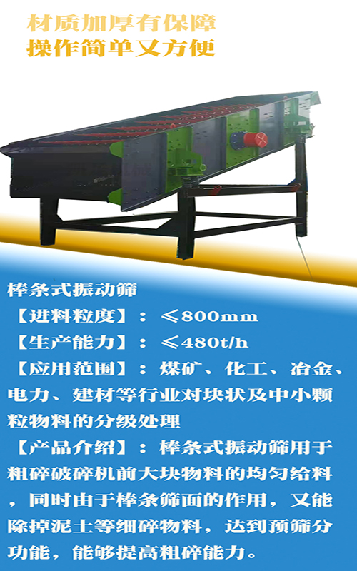棒條式自清理振動(dòng)篩用于破碎機(jī)前大塊物料的均勻給料及分離,棒條式振動(dòng)篩特別適用于水電行業(yè)、建筑石料及黑色或有色金屬、礦石粗破前給料和初篩;棒條式振動(dòng)篩振動(dòng)給料機(jī)采用振動(dòng)電機(jī)為激振源,結(jié)構(gòu)簡(jiǎn)單、維護(hù)方便;產(chǎn)量大,壽命長(zhǎng),結(jié)實(shí)耐用。