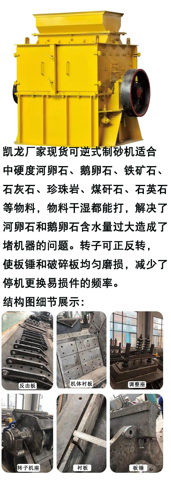 可逆反擊式制砂機,是針對礦山采石場大量粒度5-15mm的瓜米石需要制砂而研制的制砂機械。該機工作時在電動機的帶動下,轉子高速旋轉,石料進入板錘作用區時,與轉子上的板錘撞擊破碎后拋至反擊襯板上再次撞擊破碎,然后又從反擊襯板上彈回到板錘作用區重新撞擊破碎,此過程重復進行,石料由大到小進入第一、第二、第三破碎。