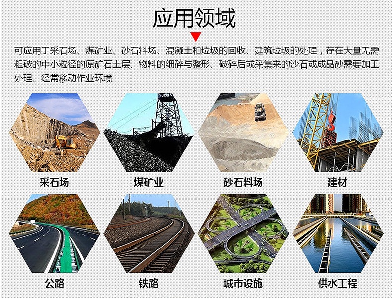【應用領域】:主要應用于高速公路、鐵路、機場跑道、礦山、煤礦、建筑、垃圾及建筑垃圾的循環再利用、水電工程、城市基礎設施、道路或建筑工地等需要搬遷,流動性強的作業。
