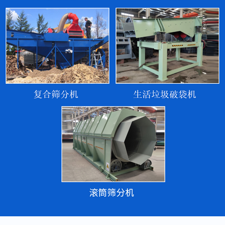 然后垃圾進入到滾筒篩處理,滾筒篩的篩孔大小根據垃圾篩分需求定制,垃圾通過滾筒篩,小的垃圾進入到下層,將垃圾分為篩上物和篩下物,篩下物以腐殖土為主,通過處理做為園林綠化的有機土進行使用。