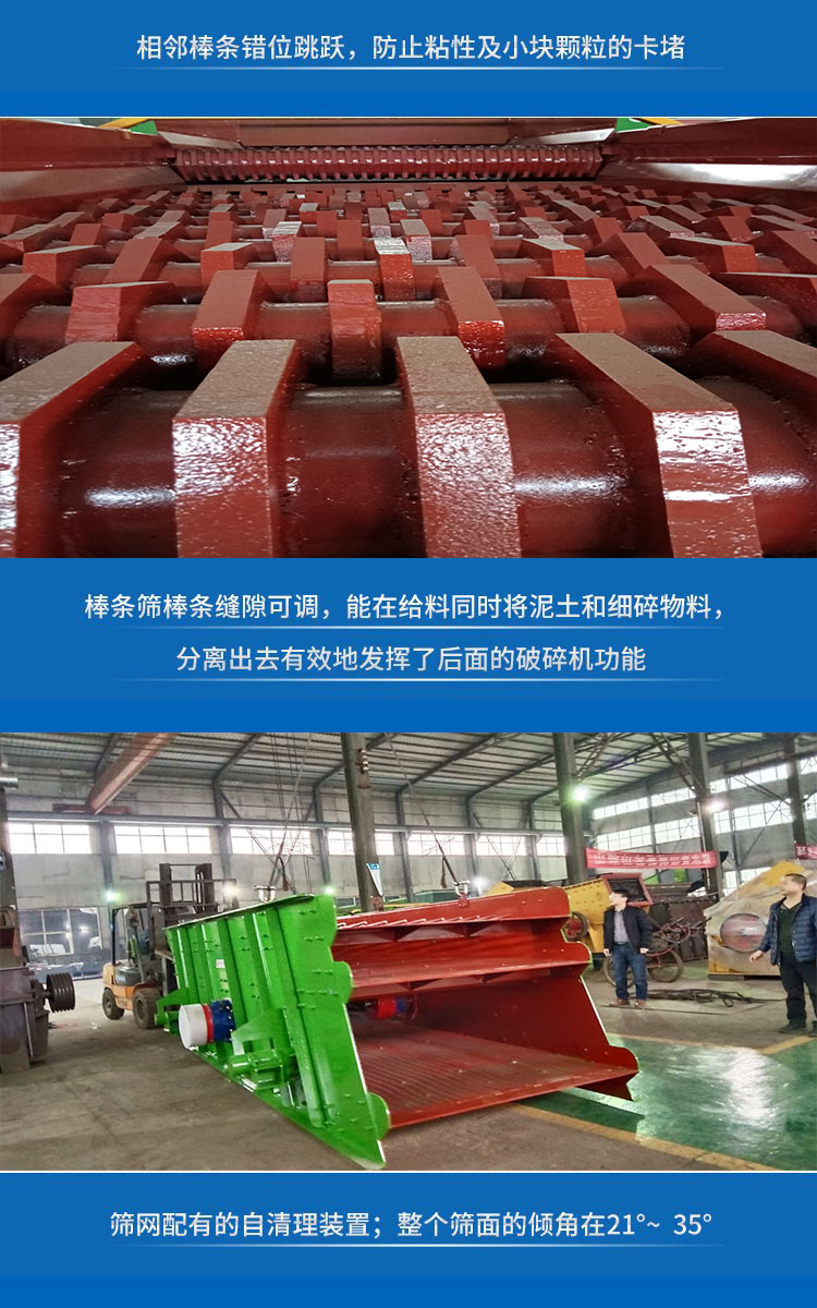 棒條式篩分機(jī)設(shè)備特點(diǎn):由于各點(diǎn)的速度是周期性變化的,故考慮水平、垂直方向的速度值。沿篩面長度方向上,從進(jìn)料端開始,物料運(yùn)動速度為遞減狀態(tài)。篩箱上各點(diǎn)沿篩面的水平分速度變化完全相同,具有相同的幅值和相同的相位,這保證了物料顆粒的正常輸送;在垂直于篩面的分速度在進(jìn)料端,逐漸遞減,可以保證在進(jìn)料端物料有足夠的大的速度起跳,使進(jìn)料端粒度分布的物料有足夠的能力向前運(yùn)動,均勻分層,而篩體中部有較穩(wěn)定的料流速度,物料透篩概率增大,從而提高了篩分效率。