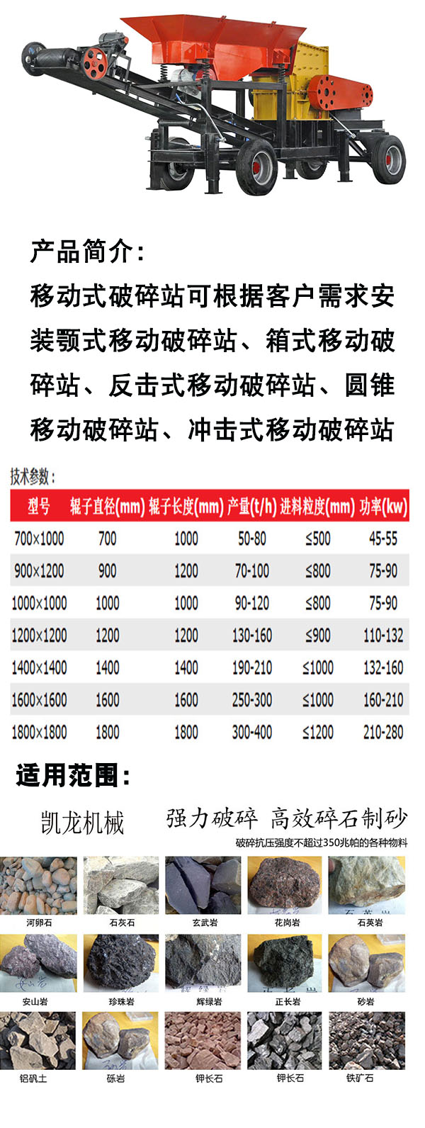 廠家直銷大口徑移動式破碎站,對玄武巖、花崗巖、石灰?guī)r、鵝卵石、青石、金礦石、鐵礦石、煤矸石、建筑垃圾等均有良好粉碎效果,經(jīng)上百家用戶使用設備后,反映良好,采購回頭率高達50%,讓設備效果說話,我廠設備質(zhì)量可靠,售后服務完善,讓您買的放心!用的舒心!