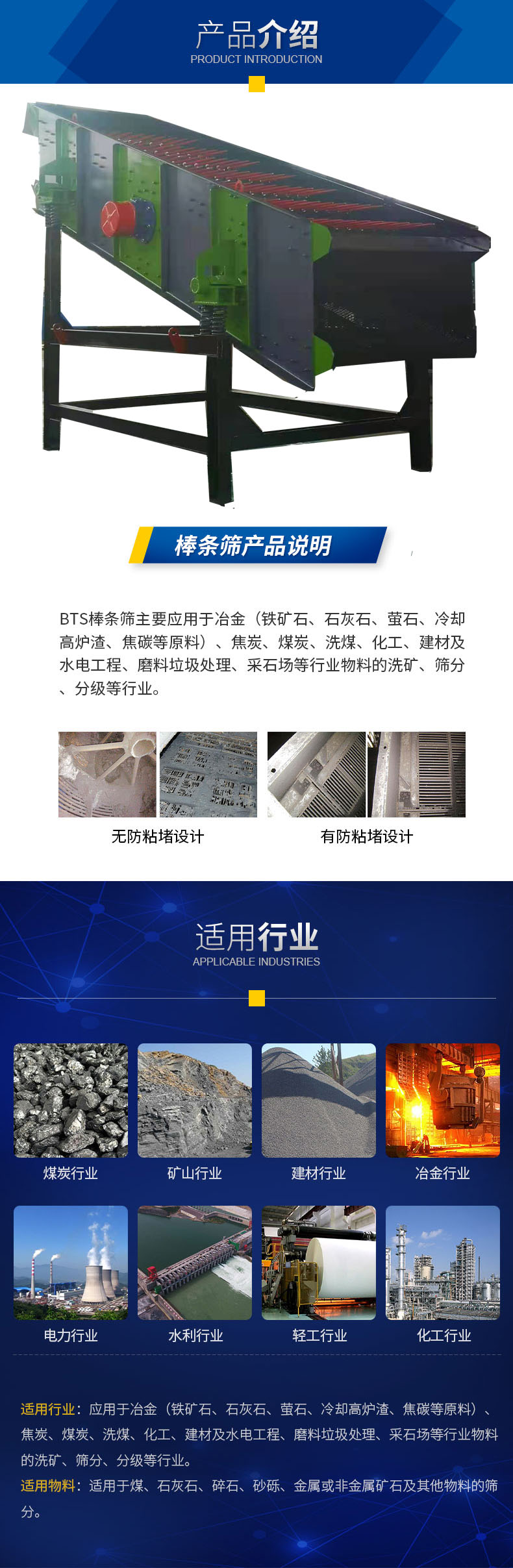 凱龍廠家現貨棒條篩是指物料在網面上做圓形運動,用于煤炭、冶金、礦山等部門作產品分級用,該振篩機處理能力強,篩分效率高,具有技術參數合理,結構強度、剛度高,運轉可靠,噪音小,維修方便等特點。主要應用于冶金(鐵礦石、石灰石、螢石、冷卻高爐渣、焦碳等原料)、焦炭、煤炭、洗煤、化工、建材及水電工程、磨料垃圾處理、采石場等行業物料的洗礦、篩分、分級等行業。BTS棒條振動篩各種幅面規格和篩孔尺寸的新型結構模式篩板,尤以通用于沖擊性強、硬度大、耐磨性高要求的場合。BTS棒條振動篩在鐵礦石中細碎篩分、原煤分級、黃金、建材以及水電、核電工程砂石的篩分等用耐磨篩板。